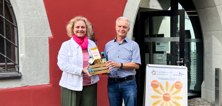 Seit 20 Jahren bietet Dieter Heinzler bei der Freiwilligenagentur im Rathaus eine kostenlose Pilzberatung an. Sophie Bader, Leiterin der Freiwilligenagentur bedankte sich mit einem passenden Geschenkkorb für das langjährige Engagement. „Auch wenn der Trend zu kurzzeitigem und projektbezogenen Engagement geht, üben viele Menschen ihr Ehrenamt über eine lange Zeit aus. Dadurch entsteht ein besonderes Verhältnis der Zugehörigkeit“ sagt Bader. „Herr Heinzler gehört nun schon seit 20 Jahren zum Team der Freiwilligenagentur und wir freuen uns, dass er der Bürgerschaft sein großes Expertenwissen jedes Jahr aufs Neue zur Verfügung stellt“.
