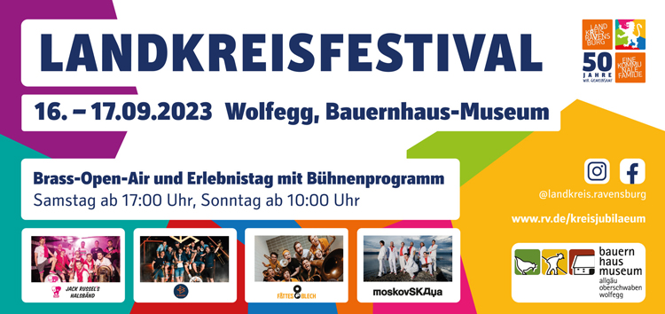 Der Landkreis Ravensburg feiert sein 50-jähriges Bestehen in diesem Jahr mit einem großen Landkreisfestival am 16. und 17. September 2023 auf dem Gelände des Bauernhaus-Museums Allgäu-Oberschwaben Wolfegg, Vogter Straße 4, in 88364 Wolfegg. Am Samstag gibt es Programm von 17:00 Uhr (Einlass 16:00 Uhr) bis 23:00 Uhr; am Sonntag von 10:00 Uhr (Einlass: 9:30 Uhr) bis 18:00 Uhr. Zu dieser Festveranstaltung lädt der Landkreis alle Bürgerinnen und Bürger herzlich ein.