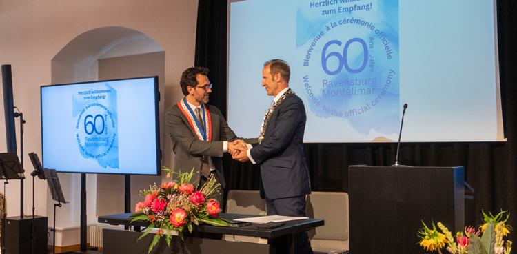 Die Stadtverwaltung Ravensburg hat vom 24. bis 26. April, Gästen aus der französischen Partnerstadt Montélimar, einen herzlichen Empfang bereitet. Anlass war das 60. Städtepartnerschaftsjubiläum. Es ist die älteste Städtepartnerschaft, die Ravensburg pflegt. Nicht nur Gäste aus Montélimar waren gekommen, sondern auch weitere Gäste aus anderen Partnerstädten Ravensburgs, Mollet del Vallès, Rivoli und Rhondda Cynon Taf.