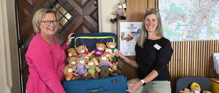 70 Hoffnungbären nahm Renate Peter, Mitgründerin der Stiftung Valentina und Stiftungsrätin, am Montag, 15. September in der Freiwilligenagentur der Stadt Ravensburg im Rathaus entgegen. Kleine trost- und hoffnungsspendende Teddybären, die vorab von vielen Bürgerinnen in ganz Ravensburg und darüber hinaus kreativ und individuell bekleidet wurden. Finanziert und eingekauft werden die Hoffnungbären vom Kinderschutzbund Ravensburg.