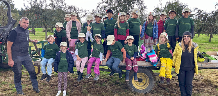 Gereon Güldenberg war von dem Einsatz der jungen Nachwuchsgärtner:innen begeistert und schätzte die Anzahl der gefüllten Kisten auf beachtliche 200 Stück, also ca. 2 Tonnen Äpfel! Gleichzeitig bekamen die Kinder einen kleinen Einblick in die Welt und Arbeit auf dem Rösslerhof, der neben Streuobstwiesen, Milchvieh und Rinderhaltung auch Ackerbau nach strengen Bioland-Richtlinien betreibt.