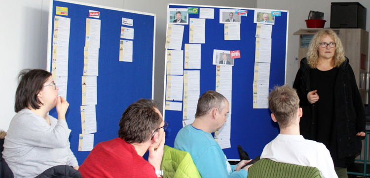 Anschließend wurden die Kanzlerkandidaten vorgestellt und was diese zum Thema Inklusion zu sagen haben. Dadurch entwickelte sich eine lebhafte und teils kontroverse Diskussion unter den Beschäftigten darüber, welche Partei und welchen Direktkandidaten man wählen sollte. Auch die Frage „Was ist Demokratie“ wurde besprochen. Die Antworten kamen prompt: Alle Menschen entscheiden mit, jeder Mensch ist wichtig, jede Stimme zählt. So wurde klar, dass jeder eine politische Verantwortung hat und dass politische Entscheidungen direkte Auswirkungen auf das Leben von Menschen mit Behinderungen haben, sei es in den Bereichen Bildung, Arbeit, Gesundheit oder soziale Teilhabe.