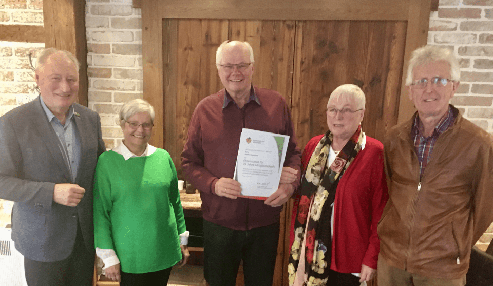 Ehrung für 25 Jahre Mitgliedschaft und Engagement in der Gruppe Ravensburg (von links): Stadtrat und Wanderführer August Schuler, Vorsitzende Hannelore Blum, Jubilar Heinrich Hausmann, 2. Vorsitzende Elfriede Regali, Bodensee-Gauvorsitzender Franz Rimmele (Althausen). Bild: Albverein Ravensburg