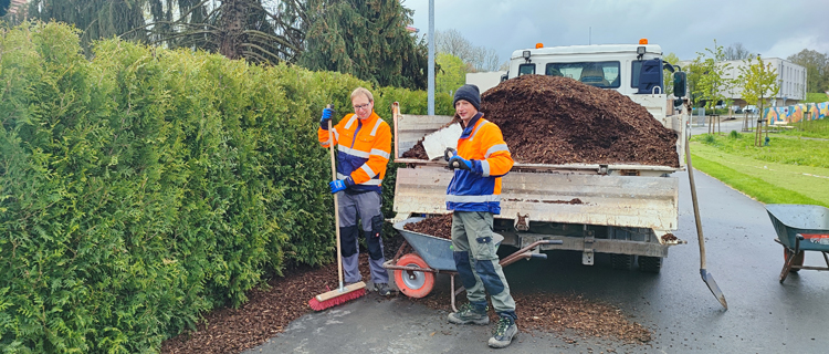 Gemeinsam mit einem Vorarbeiter der Firma Köhle laden Peter und Fridolin nun Rindenmulch aus einem LKW-Hänger ab. „Wir verteilen den Rindenmulch am Rand der Hecken und Rosenbeete, damit alles schön ordentlich aussieht“, erklärt Fridolin. Er möge es gerne, wenn nach seiner Arbeit die Beete sauberer und gepflegter als zuvor aussehen. Zudem gebe es ihm ein gutes Gefühl, wenn er nach Feierabend sehe, was er am Tag geschafft habe, erzählt er. „Am liebsten habe ich Rollrasen verlegt“, fügt der 29-Jährige lachend hinzu. Peter berichtet, dass ihm besonders das Pflanzen von Blumen Spaß gemacht habe.