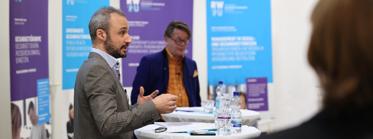 Auf dem Podium standen sich zwei Professoren der RWU gegenüber: Jan-Marc Hodek, Leiter des Studiengangs Gesundheitsökonomie, und Maik H.-J. Winter, Leiter des Studiengangs Pflege sowie des Instituts für gerontologische Versorgungs- und Pflegeforschung. Gemäß ihrer Fachdisziplinen vertraten sie unterschiedliche Perspektiven auf die Zukunft des Gesundheitssektors, auf der einen Seite die Ökonomie auf der anderen die Versorgungsforschung.