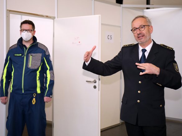 Die zu realisierende Infrastruktur und Logistik beschränkt sich hier nicht nur auf die direkten Bereiche der eigentlichen Impfung, sondern auch der Mitarbeiter. „Wir werden hier rund 60 Mitarbeiter und 14 Ärzte im 2-Schichtbetrieb im Einsatz haben. Da werden natürlich auch entsprechende Pausen und Aufenthaltsräumlichkeiten benötigt“, berichtet Surbeck weiter. Während die regionale „Blaulicht-Familie“ sich um Aufbau und die Unterhaltung der Räumlichkeiten kümmert, stehen vor der Kreisverwaltung weitere organisatorische Herausforderungen. So fällt zum Beispiel auch die Bereitstellung der IT-Technik und die personelle Besetzung der nichtmedizinischen Bereiche in den Zuständigkeitsbereich des Landkreises.