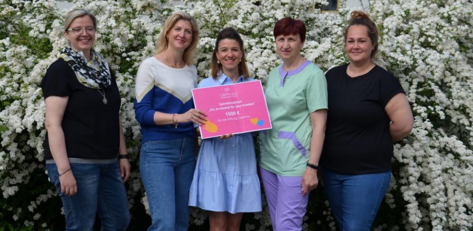 100 Armbänder für den Frieden hat das Schmuck-Atelier Copines aus Ravensburg zugunsten der geflüchteten Ukrainerinnen und Ukrainer, die bei der Stiftung Liebenau untergebracht sind, angefertigt. Aus dem Verkauf wurde der Gesamterlös in Höhe von 1.500 Euro nun vor Ort übergeben.