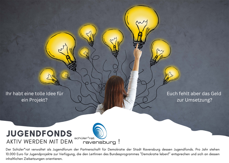 Für Jugendprojekte stehen im Jugendfonds „Demokratie leben!“ für das Jahr 2025 wieder Fördergelder in Höhe von insgesamt 10.000 Euro zur Verfügung. Der Schülerrat Ravensburg verwaltet diese Fördermittel für die Stadt Ravensburg und entscheidet über deren Vergabe. Auf der städtischen Homepage steht ein Antragsformular zum Download bereit. Bewerbungen nimmt die Geschäftsstelle des Schülerrates beim Amt für Bildung, Soziales und Sport der Stadt Ravensburg entgegen.
