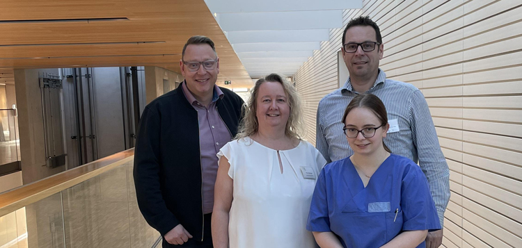 Pflegedirektor Swen Wendt, Ausbildungskoordinatorin Petra Metzger, Leiter Pflege- und Prozessmanagement Matthias Schäfer und MFA Pia Rothenbacher (von links). Bild: Anna Denzel, Oberschwabenklinik