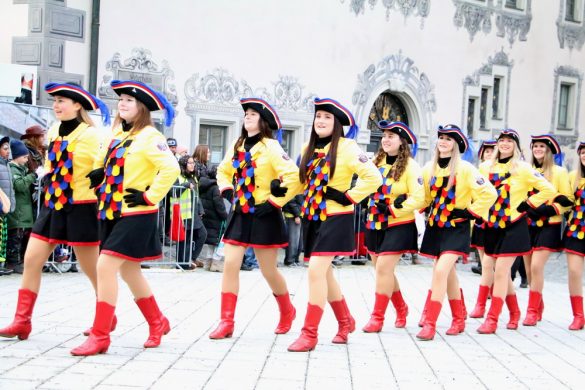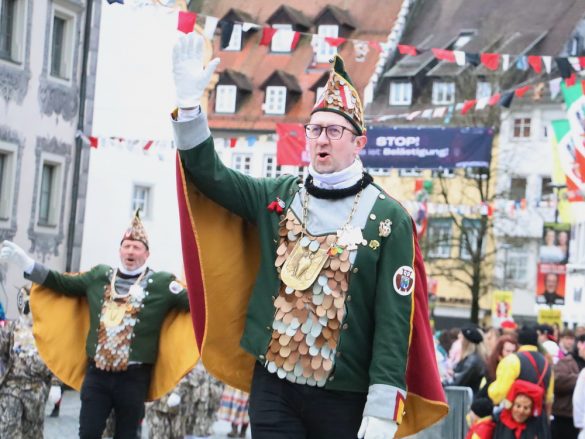 Zu Beginn des farbenfrohen Spektakels blitzte sogar die Sonne über der Ravensburger Innenstadt – wenn auch nur für den ersten Teil. Danach wurde es für die Tausenden von Zuschauern doch recht frostig. Der Stimmung tat dies freilich keinen Abbruch, und für die Antwort auf den richtigen Zunftruf waren die Narren nicht allzu geizig mit dem Verteilen von Süßigkeiten.