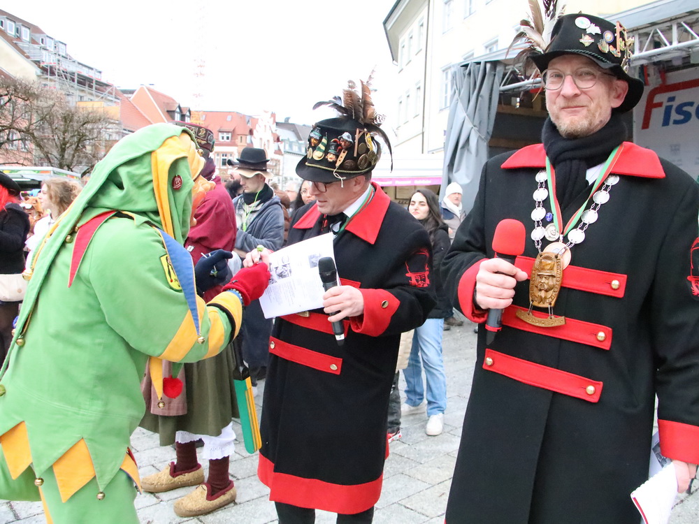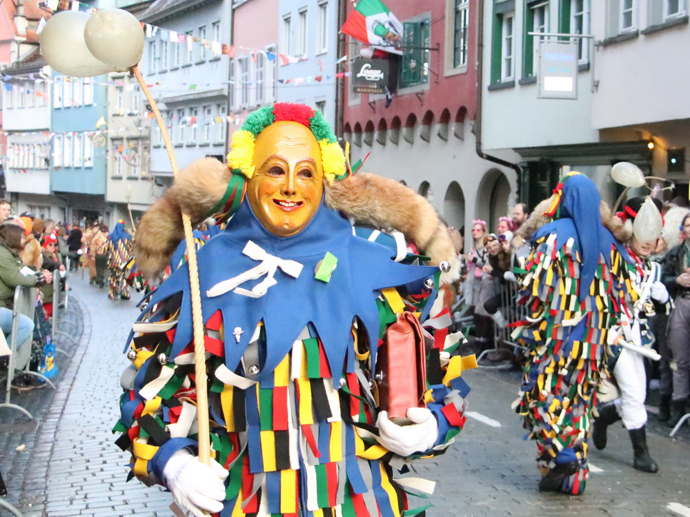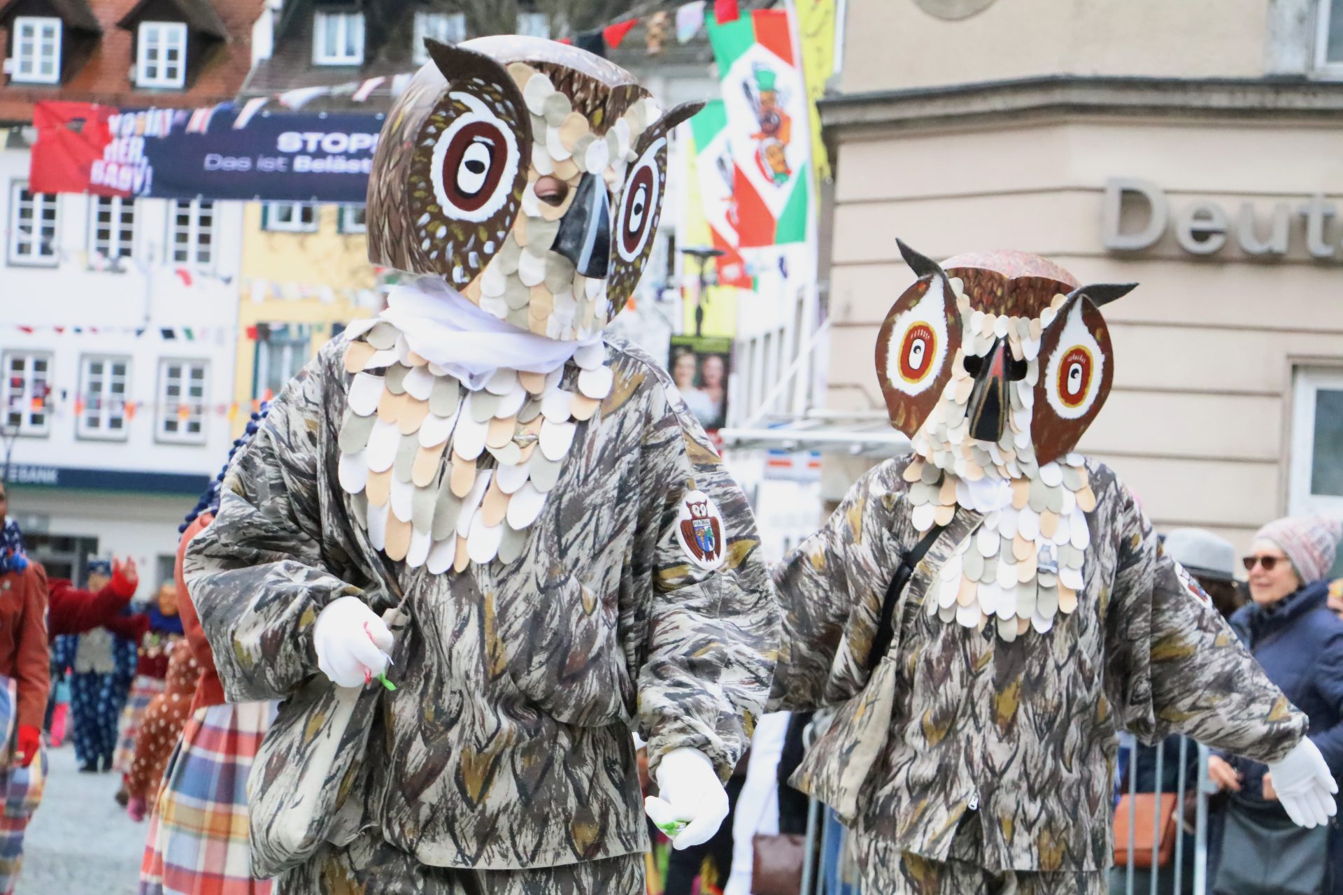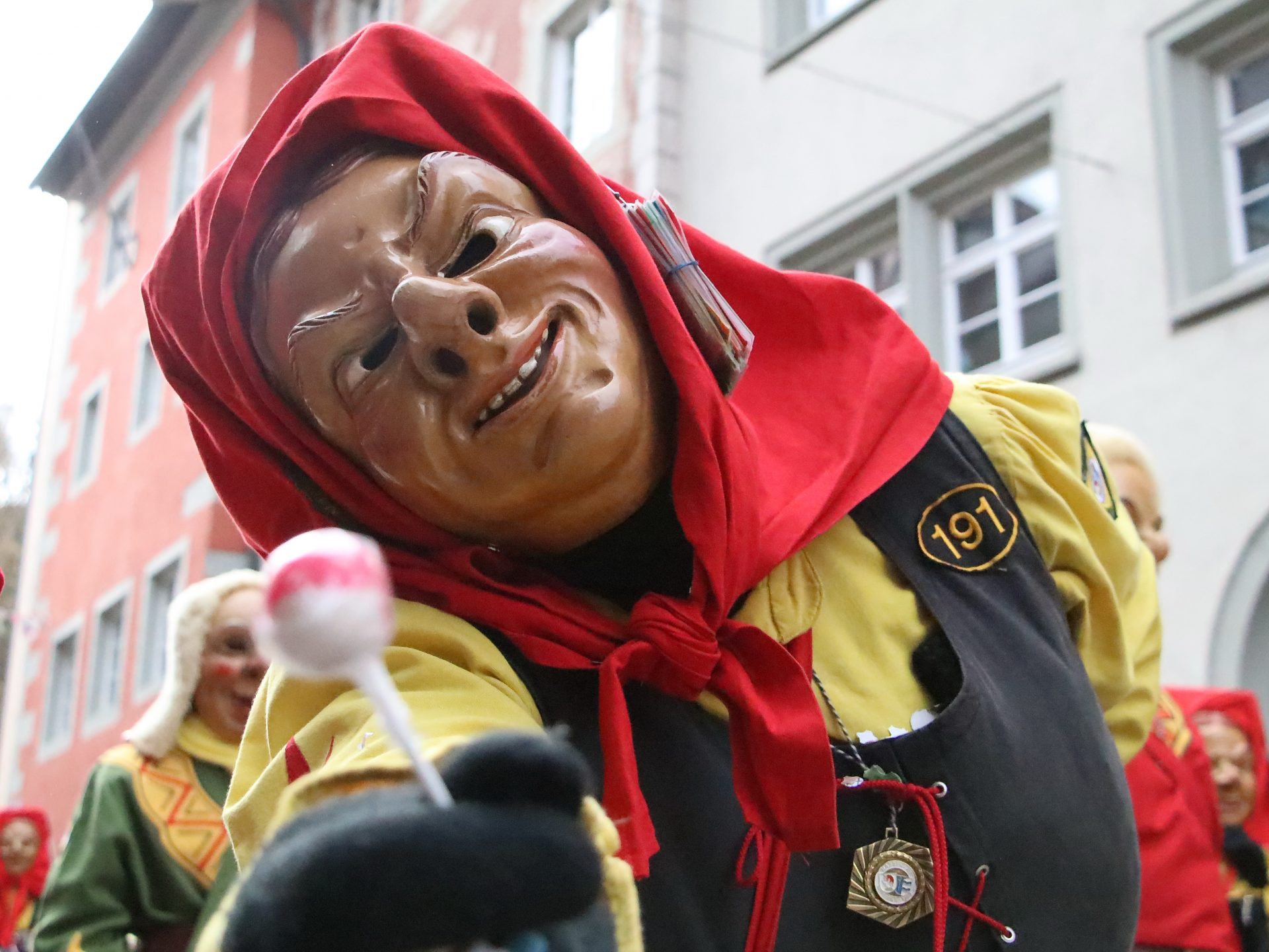 Zu Beginn des farbenfrohen Spektakels blitzte sogar die Sonne über der Ravensburger Innenstadt – wenn auch nur für den ersten Teil. Danach wurde es für die Tausenden von Zuschauern doch recht frostig. Der Stimmung tat dies freilich keinen Abbruch, und für die Antwort auf den richtigen Zunftruf waren die Narren nicht allzu geizig mit dem Verteilen von Süßigkeiten.