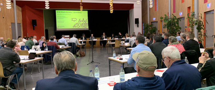 Die Gemeinde- und Ortschaftsräte waren froh vom Planungsteam zu hören, dass die Detailplanung für die Variante Ost schon begonnen hat und kontinuierlich weiter geht. Dass es aber noch einige Jahre hin zu einer neuen B 30 sein werden, machte Anne Dittmann vom Planungsteam deutlich. „Neben den vielen noch notwendigen Planungs- und Verfahrensschritten braucht es seine Zeit, bis die 17 km lange Trasse ausgeplant und abgestimmt ist.“ In der im Vergleich zur Westvariante deutlich längeren Strecke der Variante Ost liegen aber gewichtige Vorteile. Sie verbindet nämlich auch die B 467 bei Tettnang mit der B 30 bei Friedrichshafen. Diese sogenannte „Querspange Tettnang“ ist im Bedarfsplan des Bundes als eigenes Projekt enthalten und praktisch in der Variante Ost enthalten. Durch die Querverbindung wird insbesondere der Tettnanger Teilort Kau deutlich vom Durchgangsverkehr entlastet. Auch Liebenau, das die B 30neu westlich umfährt, wird von einem großen Teil des Verkehrs befreit.
