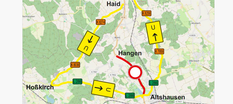 Die B 32 ist im Bereich zwischen Hangen und der Einmündung der L 286 voll gesperrt. Der Verkehr mit Fahrtziel Reutlingen, Sigmaringen oder Bad Saulgau wird ab der Querspange der L 286 in Altshausen – Hauptstraße – Ebersbacher Straße – L 286 – K 7959 – Dornahof – Luditsweiler und weiter über die K 8258 nach Hochberg und am Kreisverkehr bei Bad Saulgau wieder auf die B 32 geleitet.