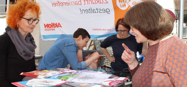 „Zukunft barrierefrei gestalten“: So lautet das diesjährige Motto von Aktion Mensch zum Europäischen Protesttag. Auch auf dem Bodnegger Wochenmarkt war deswegen die Stiftung Liebenau mit einen Infostand zum Thema „Unterstützte Kommunikation“ (UK) vertreten. Denn Barrieren sind nicht nur die klassischen Treppenstufen, sondern auch die Sprache kann eine Barriere darstellen.