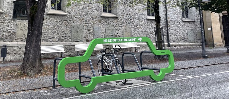 Durch seinen grünen Umriss in Form eines Autos ist er ein echter „Hingucker“ und macht deutlich, dass ein parkendes Auto so viel Platz einnimmt wie zehn Räder. Mit dieser Botschaft ist das das „Car Bike Port“ vom Marienplatz nun an seinen neuen Standort gewandert, um auch hier das Bewusstsein der Öffentlichkeit dafür zu schärfen, wieviel Platz parkende Autos im öffentlichen Raum einnehmen.
