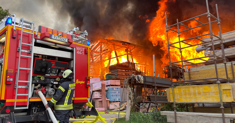 Um kurz nach 7 Uhr erfolgte die erste Alarmierung der Feuerwehr Schlier. Schon auf der Anfahrt ließ Einsatzleiter Patrick Pfleghar weitere Kräfte der Feuerwehr Weingarten nachalarmieren. Bei Ankunft der ersten Einsatzkräfte brannten zwei aneinandergrenzende Lagerhallen eines Bauunternehmens und einer Holzhandlung in voller Ausdehnung. Durch einen massiven Löschangriff gelang es, ein Übergreifen der Flammen auf direkt angebaute Garagen und ein Wohnhaus zu verhindern. Die beiden Hallen brannten allerdings samt der gelagerten Materialen, Fahrzeuge und Gerätschaften völlig ab. Verletzt wurde niemand.