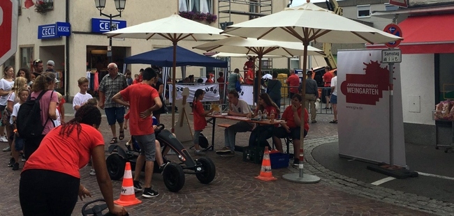 Bereits am Samstagvormittag fand in der Innenstadt von Weingarten die 20. Kinderolympiade für Kinder zwischen fünf und elf Jahren statt. Die Jugendlichen des Jugendgemeinderates Weingarten waren bei dieser Veranstaltung vor Ort aktiv und haben Kinder beim Go-Kartfahren unterstützt und betreut.