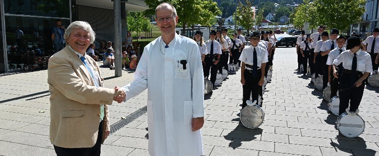Groß war die Freude vor dem Krankenhaus über den Auftritt der blau-weiß uniformierten 13- bis 16-jährigen Mädchen und Jungen, die vom Rutenfest-Trommlerbeauftragten Kurt Schlachter (seit rekordverdächtigen 52 Jahren im Amt) angeführt wurden. Auch einige Patienten und die Kleinen vom benachbarten Kindergarten „Casa Elisa“ schauten vor dem EK begeistert zu und wippten mit den Köpfen. PD Dr. Andreas Artlich, Chefarzt der Klinik für Kinder und Jugendliche, und sein Team strahlten ebenfalls. „Schön, dass ihr wieder da seid. Wir haben euch vermisst“, sagte Artlich. „Es war keine leichte Zeit in den letzten zwei Jahren für die Kliniken und auch nicht für die Kinder, jetzt freuen wir uns umso mehr. Auch wenn ihr wegen der Corona-Bestimmungen leider nicht ins Krankenhaus zu den Patienten könnt, ist euer Besuch doch ein großes Zeichen der Anerkennung für uns, unsere Patienten und unsere Mitarbeiter.“