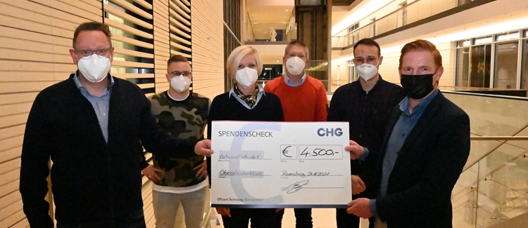 Einen Kleinbus oder Transporter für über drei Monate bei den bekannten Unternehmen zu leihen, erwies sich als schwierig. In dieser Situation sprang das Unternehmen CHG-MERIDIAN in Weingarten ein. Mit einer Spende von 4.500 Euro machte es möglich, dass die OSK einen Mercedes Vito für das Impfteam bis Jahresende zur Verfügung gestellt bekommt. Steffen Schaz (rechts), Head of Group Sales Development bei CHG-MERIDIAN, überbrachte die Spende dem Koordinationsteam der mobilen Impfkampagne (von links) Swen Wendt, Nicolas Pill, Simone Burkert und Daniel Eßer.