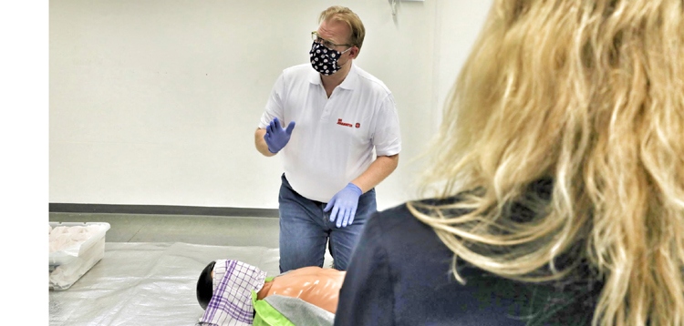 „Es muss gewährleistet sein, dass sich die Teilnehmenden in einer geschützten Lernumgebung aufhalten“, sagt Anja Spintzyk, Ausbildungsleiterin bei den Johannitern im Regionalverband Oberschwaben/Bodensee. „Wir sorgen in unseren Räumen für die Einhaltung der Sicherheitsbestimmungen wie die Abstandswahrung durch eine verringerte Teilnehmerzahl und intensivierte Desinfektion. Bei Kursen für Ersthelfer in Betrieben oder geschlossenen Gruppen prüfen wir die Rahmenbedingungen im Voraus individuell und legen diese verbindlich fest.“ Das bedeute zwar zusätzlich mehr Aufwand in der Vorbereitung, dieser sei allerdings zum Schutz der Teilnehmenden unerlässlich,“ sagt Spintzyk.