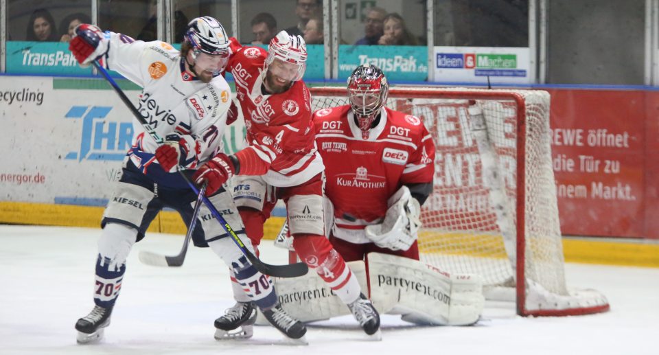 Die Towerstars liefen bis auf den erkrankten Verteidiger Daniel Schwaiger in gleicher Besetzung auf, wie zwei Tage zuvor beim Auftakt der Finalserie. Dass Bad Nauheim vor stimmungsvoller Kulisse im Colonel-Knight-Stadion von Beginn an mit Vollgas in Richtung Ravensburger Tor ziehen würde, war sicherlich keine Überraschung. Mick Köhler verbuchte auch bereits nach 22 Sekunden die erste Chance des Spiels für sich. Auch eine dreiviertel Minute später rutschte der Puck knapp am Tor von Jonas Langmann vorbei, als ein Schlenzer auf halbrechter Position gefährlich abgefälscht wurde. Danach wechselten die Druckverhältnisse aber deutlich in Richtung Towerstars, die in der 3. Minute durch den frei stehenden Charlie Sarault die Führung auf dem Schläger hatten. Bei ihrem Torhüter Felix Bick bedanken konnten sich die Roten Teufel auch kurz danach, als Nick Latta nach entschlossenem Antritt den Puck an den rechten Pfosten setzte. Riesenchancen hatten in der 13. Minute auch Robin Drothen und Luigi Calce, als diese nach einem Fehler der Bad Nauheimer Hintermannschaft zu zweit vor dem Tor der Gastgeber auftauchten. Erneut blieb Bick aber Sieger. Die ausgelassenen Chancen sollten sich auf der Gegenseite rächen. Rund 15 Minuten waren gespielt, als die Oberschwaben nach einem Puckverlust in der Angriffszone nicht schnell genug in die Abstimmung kamen und Jerry Pollastrone frei vor dem Tor nur noch die Schlägerkelle in den scharfen Pass halten musste. Beim knappen 1:0 für Bad Nauheim blieb es dann auch bis zur ersten Pause.