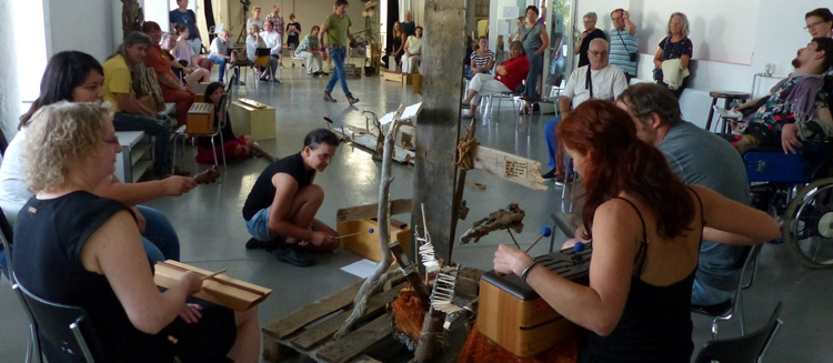 Unzählige Holzinstrumente sind im großen hellen Raum verteilt: Xylophone, Rasseln, Cajons, Rätschen, Klanghölzer. Und sechs übergroße Kunstwerke aus Holz. Zu Beginn besingt der Chor der Teilnehmenden den Holzweg und die „hölzerne Fantasie“. Dann war das Publikum eingeladen, den Akteuren bei der Vorstellung der Skulpturen durch den Raum zu folgen. Die Klänge der Instrumente waren mal laut mal leise, mal rhythmisch afrikanisch, mal entführten sie mit Regenrohr und Tiergeräuschen in den Dschungel, mal zu Rübezahl. Sprache und Gesang boten Einblick in die Gedanken beim Entstehungsprozess und das experimentelle Wirken. Die Anwesenden ließen sich fasziniert – teils mit geschlossenen Augen – in diese Zauberwelt entführen.