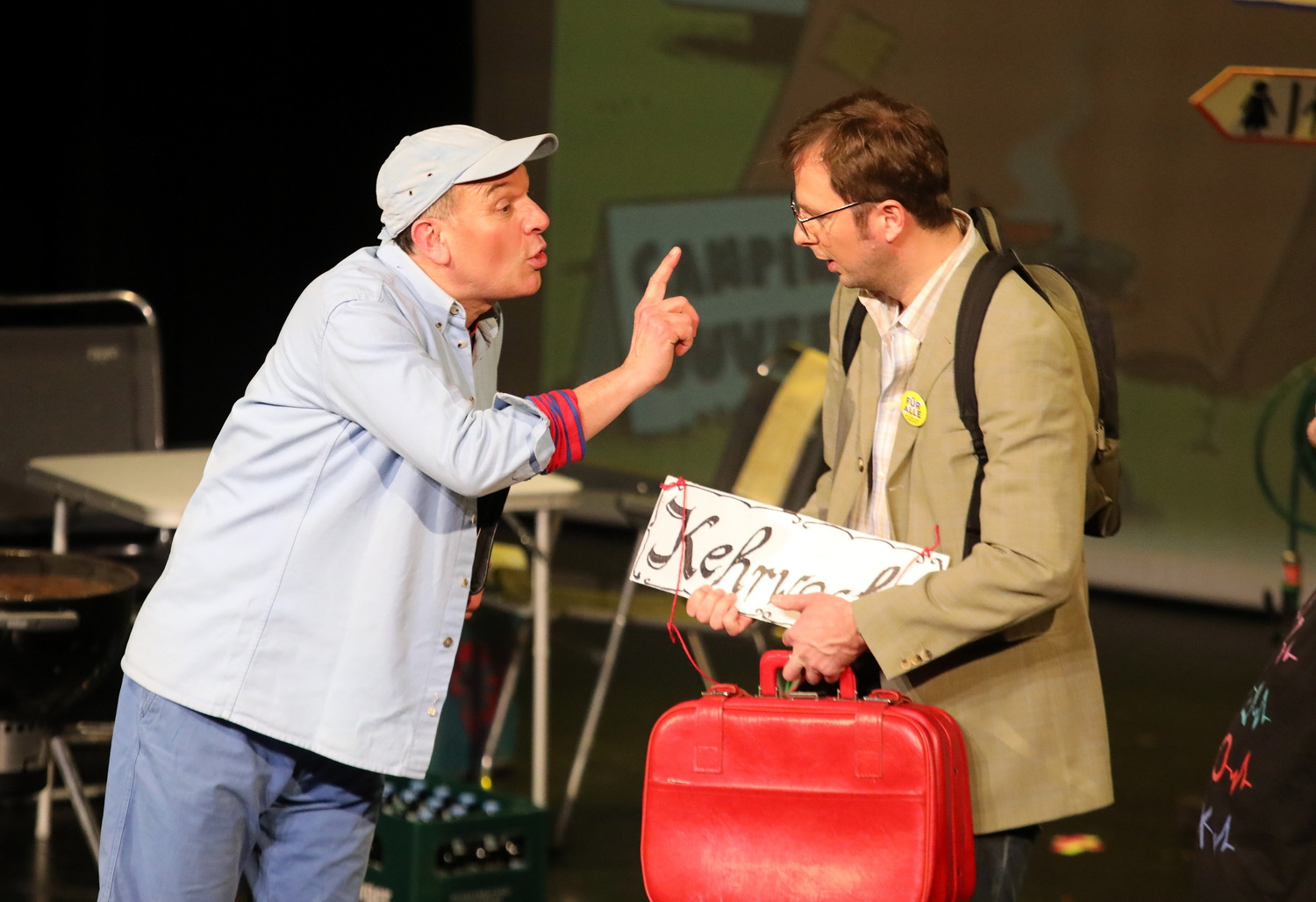 Zwar lässt der Campingplatz von Inhaber Pierre Jardin (Christoph Stehle) beim Komfort einige Fragen offen, doch immerhin gibt es ein ausgewogenes Yoga-Programm von Lebenskünstler Udo Rashwaragrami – ursprünglich aus Wigratzbad. Der bietet auch den oberschwäbischen Gästen den Yoga-Einklang und Energiefluss, beispielsweise mit den Positionen der „Brezel“ oder dem „geschwollenen Leberkäs´“.
