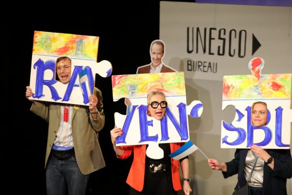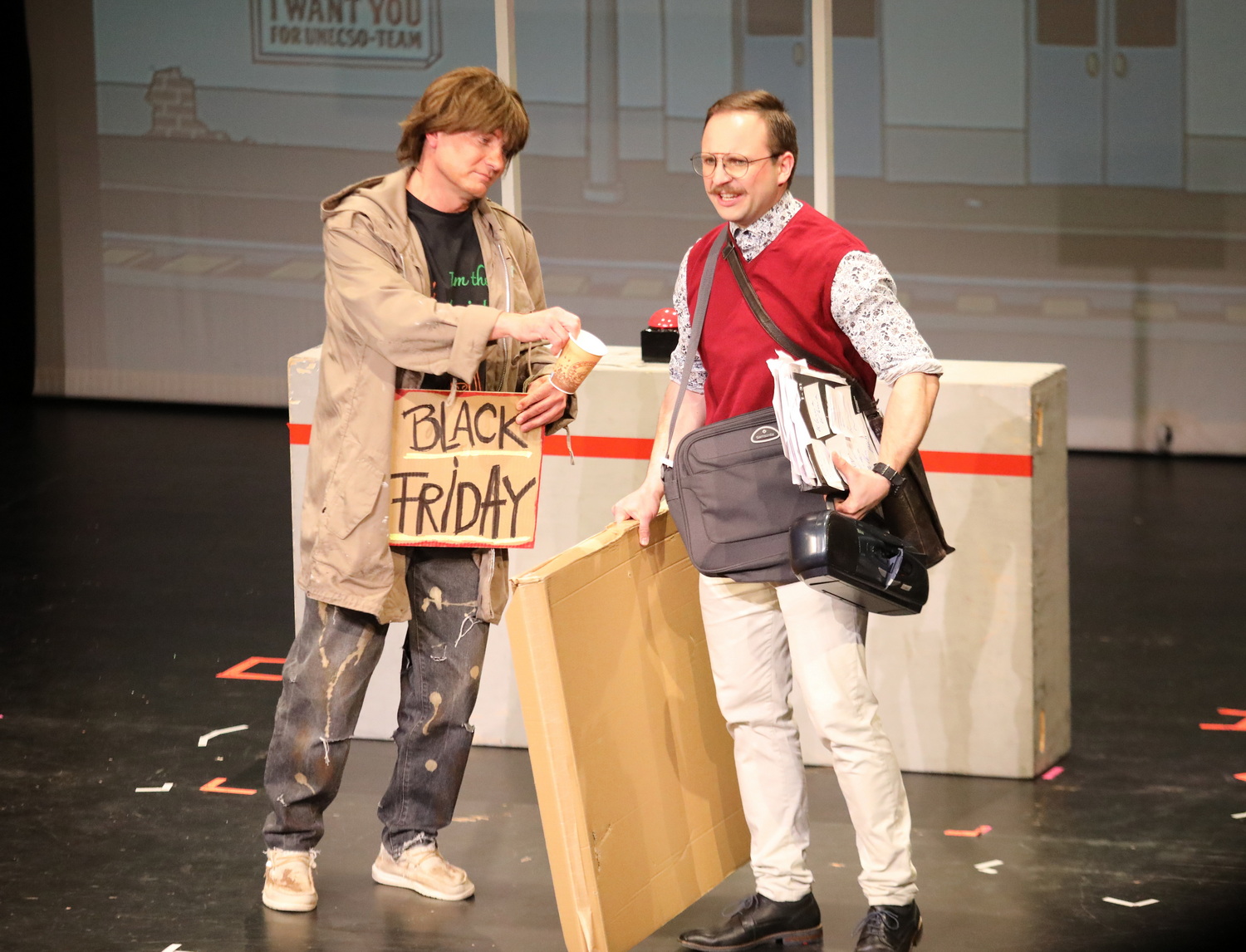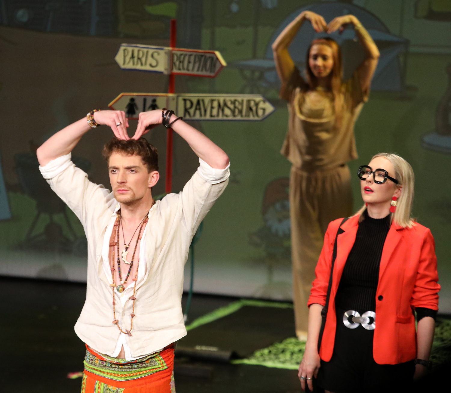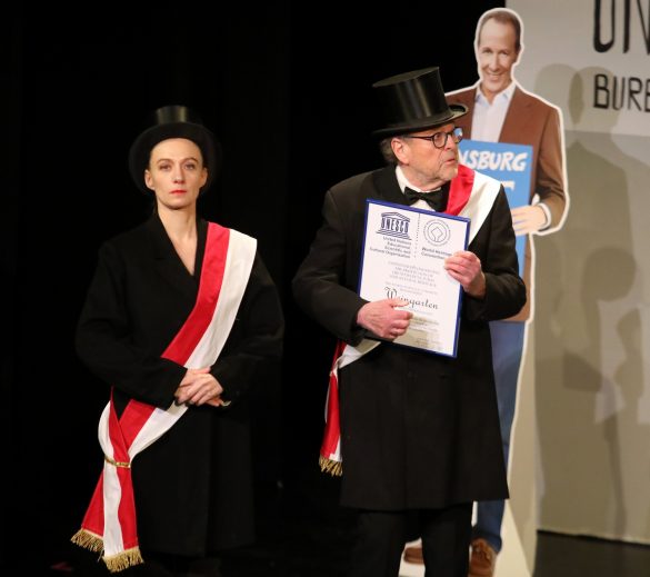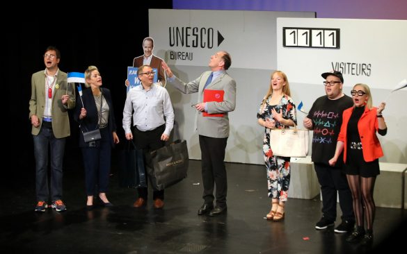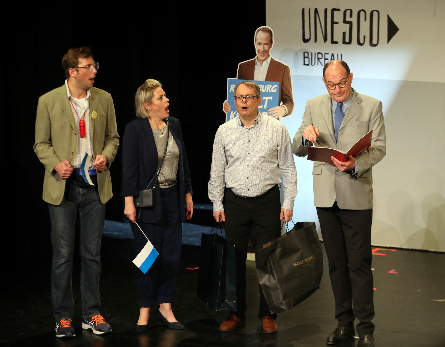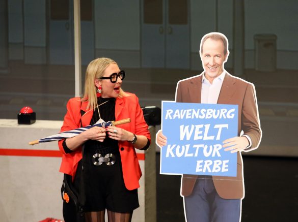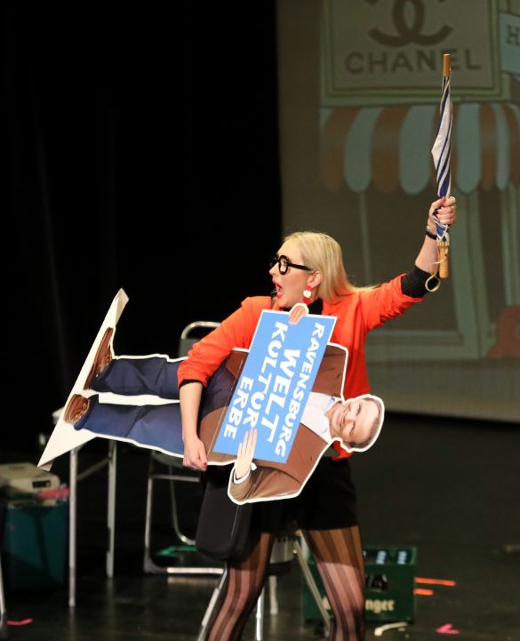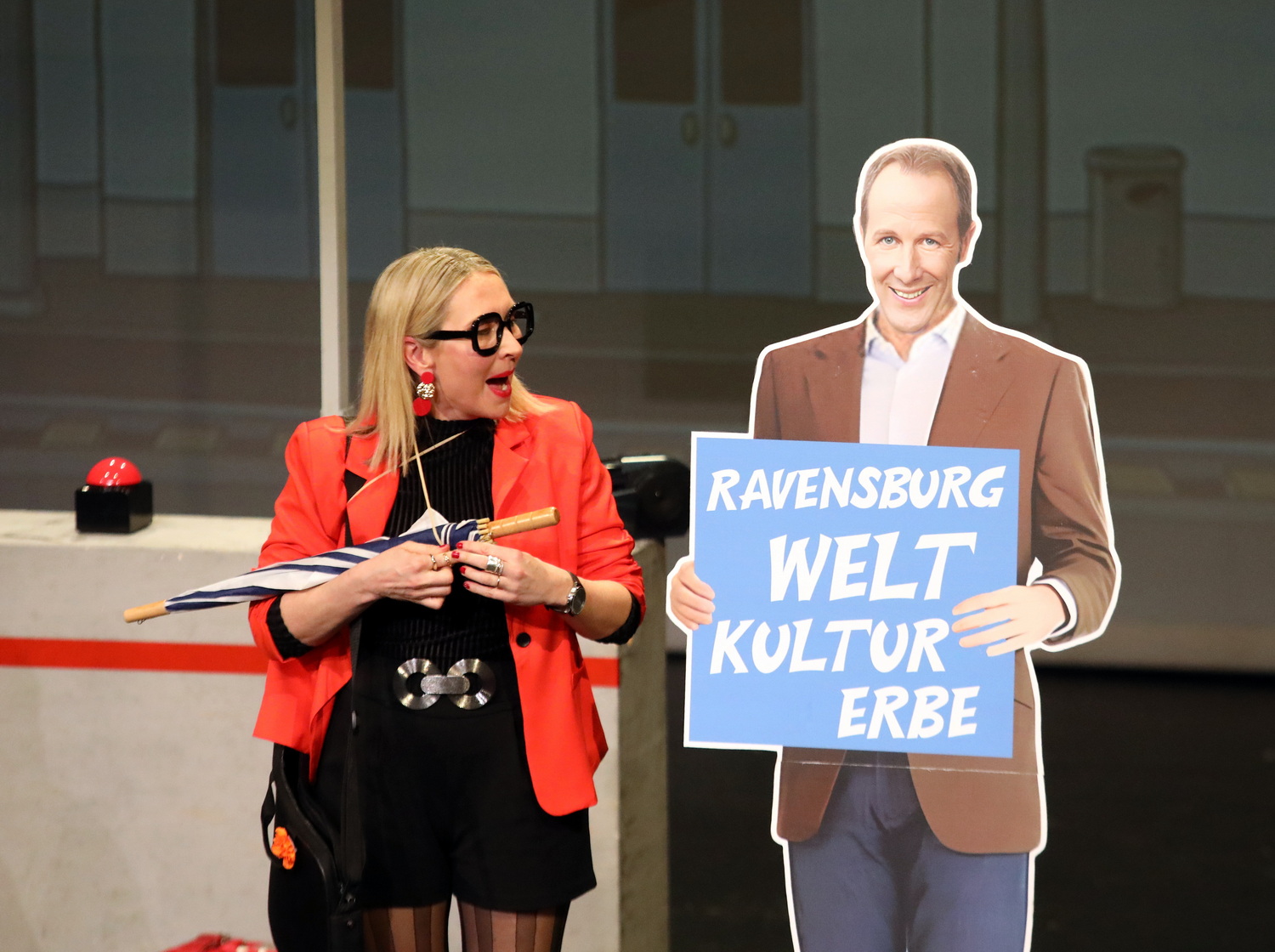 Nach so mancher sonstigen Hürde kommen schließlich alle, die nach Paris wollen, dort an, und es stellt sich die spannende Frage: Wird dem Ravensburger Antrag auf das UNESCO-Weltkulturerbe entsprochen? Die Weingartner Delegation kommt kurz zuvor mit ziemlich hängenden Köpfen vom Vorsprechen raus, weil alle Antrags-Argumente widerlegt wurden und „das einzige, was in Weingarten schön sei, der Blick auf Ravensburg wäre.“ Doch Stadtmarketing-Beauftragte Birgit Krämer bleibt zuversichtlich, bringt den „Papp-Rapp“ in Stellung und übt mit der gesamten Delegation noch einmal das Schwenken der blau-weißen Fähnchen. Doch alles ist und bleibt vergebens … Warum konkret das Ravensburger Ortsschild keinen UNESCO-Weltkulturerbe-Aufkleber bekommt, verraten wir jetzt aber nicht.