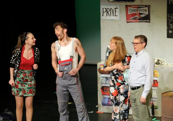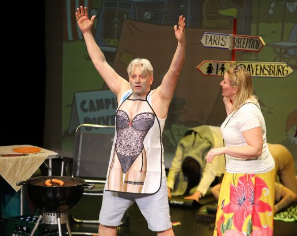 Zum Hintergrund der Geschichte: Ravensburg will unbedingt Weltkulturerbe werden und hat daher eine Delegation zusammengestellt, um bei der UNESCO in Paris die Bewerbung abzugeben. Die könnte repräsentativer kaum sein. Wäre da zunächst einmal die Vertreterin des Ravensburger Stadtmarketings, Birgit Krämer (gespielt von Martina Blattner). Die aufstrebende Projektleiterin hat natürlich alles akribisch geplant – allerdings finanziell ziemlich sparsam, womit vor allem Jessica Seiler-Strom (Daniela Engelberger) ein Riesenproblem hat. Die Marketing-Angestellte bei Vetter Pharma und Delegationsvertreterin der örtlichen Wirtschaft gerät vor allem in Rage, weil sich die Reisepläne auf einen Schlag erledigt haben: Der ICE von Innsbruck nach Dortmund rauscht ohne Halt durch den chaotischen Ravensburger Bahnhof. Nach emotionaler Beratung wird entschieden: „Wir fahren mit dem MOBI!“ Aufgrund eines Kommunikationsproblems innerhalb der Familie Knörle reist die Ortschaftsdelegation „Weissenau“ übrigens separat an – umweltfreundlich und nachhaltig mit dem E-Auto. Allerdings macht die Fahrt 300 km vor Paris an einem eher schlüpfrigen, rustikalen Rasthof halt, weil der Akku leer ist. Dass die Beziehung der Knörles mit der resoluten Franziska (Anja Vogel) und ihrem Ehemann Hannes (Tobias Gerstung) auf eine harte Probe gestellt wird, ist vorprogrammiert.