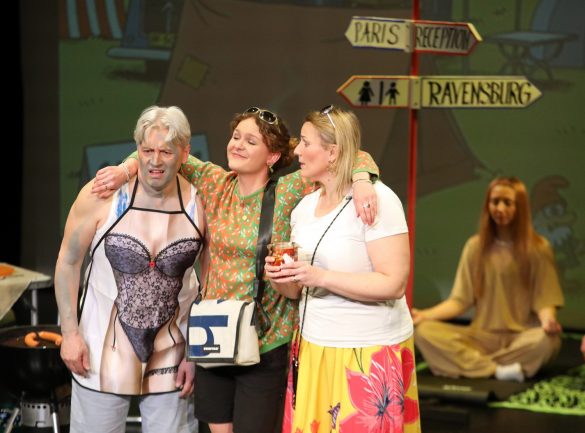 Unterdessen stockt es auch bei der übrigen Delegation. Dem Vorschlag, auf einem Campingplatz zu übernachten, wird vehement widersprochen – da schläft Jessica Seiler-Strom doch lieber auf der Sitzbank im MOBI. Auf dem gleichen Campingplatz nächtigt übrigens das Ehepaar Annelise und Rudi Sauter (Michaela Püllen und Eberhard Haug). Die wollen mit ihrem 250.000-Euro-Camper zwar auch nach Paris, aber eher zum Vergnügen. Vor allem muss das Instagram-Profil ständig mit Selfies gefüttert werden und Rudi achtet akribisch darauf, dass sein „Schatzibutzele“ Annelise das Wohnmobil auch immer gut im Hintergrund hat.