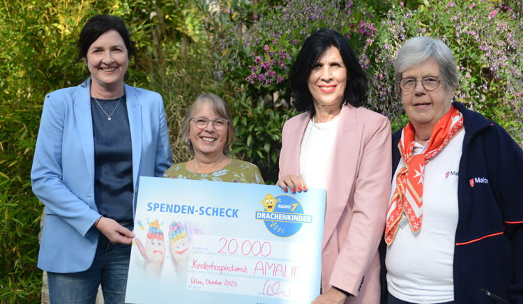 „Es ist einfach toll, dass die Drachenkinder-Aktion unsere Arbeit so regelmäßig unterstützt.“ Von links: Heike Lander (AMALIE), Elisabeth Mogg(AMALIE), Ursula Schuhmacher (Radio 7) und Elisabeth Staudenmaier(Malteser Hilfsdienst) bei der Spendenübergabe. Bild: Stitftung Liebenau