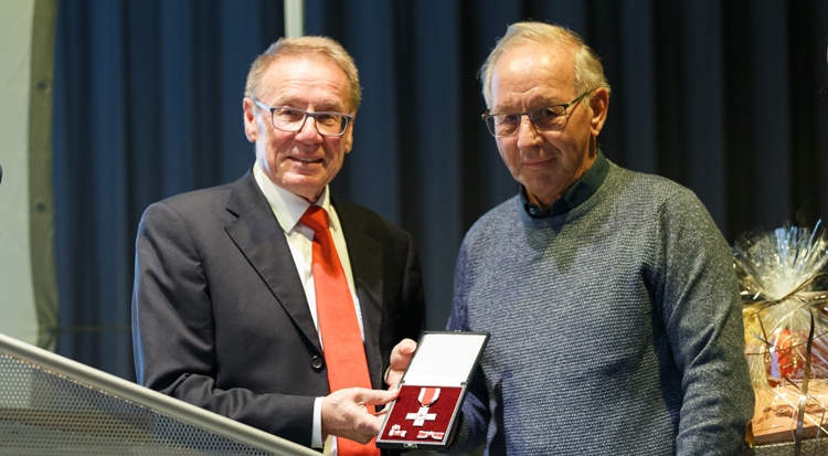 Ein besonderer Programmpunkt waren die Ehrungen: Josef Haag erhielt das Ehrenzeichen des DRK-Bundesverbandes als offizielle staatliche Auszeichnung für herausragende Verdienste und für seinen außergewöhnlichen Einsatz. Seit seinem 15. Lebensjahr ist er bei der Bergwacht – inzwischen 65 aktive Jahre in unterschiedlicher Funktion. Die Anwesenden zollten ihm dafür nicht nur Respekt, sondern auch stehenden Applaus. Die Kreisverbandsmedaille in Silber ging an Elke Markert von der DRK-Personalverwaltung sowie an Patricia und Jürgen Seils für ihre 20-jährigen Verdienste beim Ravensburger Tafelladen. Joachim Müller (Helfer-vor-Ort-Beauftragter), Lothar Kutter (stellv. Leiter Kreisauskunftsbüro, KAB) und sechs First Responder von der Hochschule Ravensburg-Weingarten erhielten die DRK-Dankesmünze.