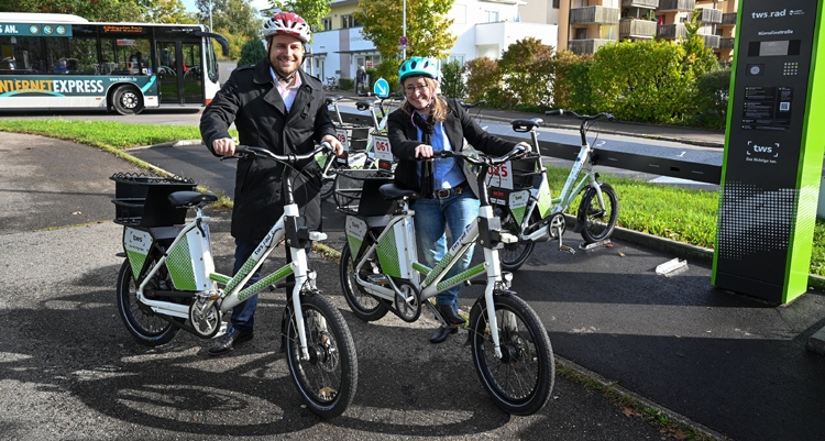 Aufsteigen und losradeln mit elektrischer Unterstützung heißt es ab sofort auch in der Ravensburger Rümelinstraße. Mit einer neuen Verleihstation für Elektrofahrräder erweitert die Technische Werke Schussental GmbH & CO. KG (TWS) ihren Service für klimaschonende Mobilität. Dort nahmen Andreas Senghas, Leiter der Wirtschaftsförderung der Stadt Ravensburg, und Jenny Jungnitz, Mobilitätsexpertin bei der TWS, die neue Station in Betrieb. „Der Standort in der Nähe der Geschäfte und neben der Bushaltestelle ist hervorragend gewählt und stärkt auch den örtlichen Einzelhandel. Hier sind viele Menschen unterwegs, die das ergänzende Angebot für Mobilität sicher gut und gerne nutzen“, freut sich Andreas Senghas. Wer mit dem Bus ankommt, kann unkompliziert auf den Drahtesel umsteigen und dank der elektrischen Unterstützung weitere Anstiege in der Weststadt oder in Richtung Schmalegg mühelos angehen.