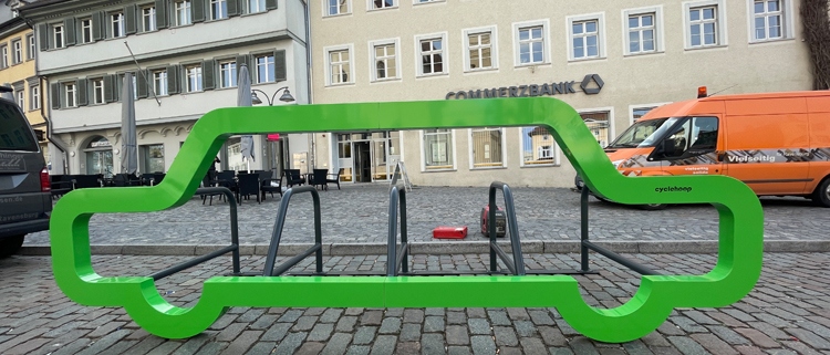 Südlich des Marienplatzes gibt es ab sofort einen neuen Abstellplatz für zehn Fahrräder. Durch seinen grünen Umriss in Form eines Autos ist er ein echter „Hingucker“ und macht deutlich, dass ein parkendes Auto so viel Platz einnimmt wie zehn Räder. Mit dieser Botschaft wird das so genannte Car Bike Port alle drei bis sechs Monate den Standort wechseln, um auch an anderer Stelle das Bewusstsein der Öffentlichkeit dafür zu schärfen, dass parkende Autos viel Platz im öffentlichen Raum einnehmen.