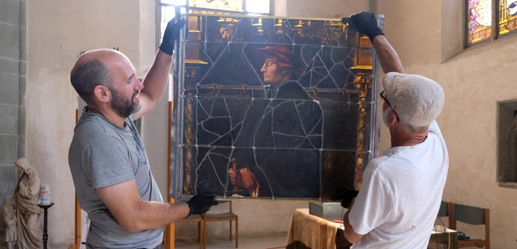 BU 1: Glasveredler Christoph Kunz und sein Kollege Arnaldo Melilli vom Glasatelier V.Saile tragen das Feld mit dem restaurierten Porträt Huldrych Zwinglis in die Kirche. Foto: bawa