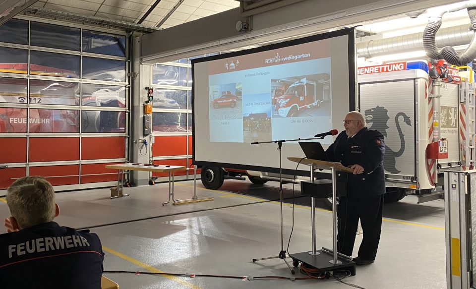 Ein großer Dank Romers galt allen Helfern, die das Stüble „Zur Saugstelle“ in vielen Stunden Eigenleistung umgebaut und modernisiert hatten. Die Stadt Weingarten unterstützte dieses Projekt durch die Bereitstellung der benötigten Materialien. Ebenso blickte Romer auf die diesjährigen Beschaffungen zurück: Neben dem neuen Kommandowagen 2 konnten auch die leichten Einsatzjacken und der Gerätewagen für die Höhenrettung (Fahrzeug des Landkreis Ravensburg) in Dienst gestellt werden, die die Einsatzfähigkeit der Wehr deutlich erweitern.
