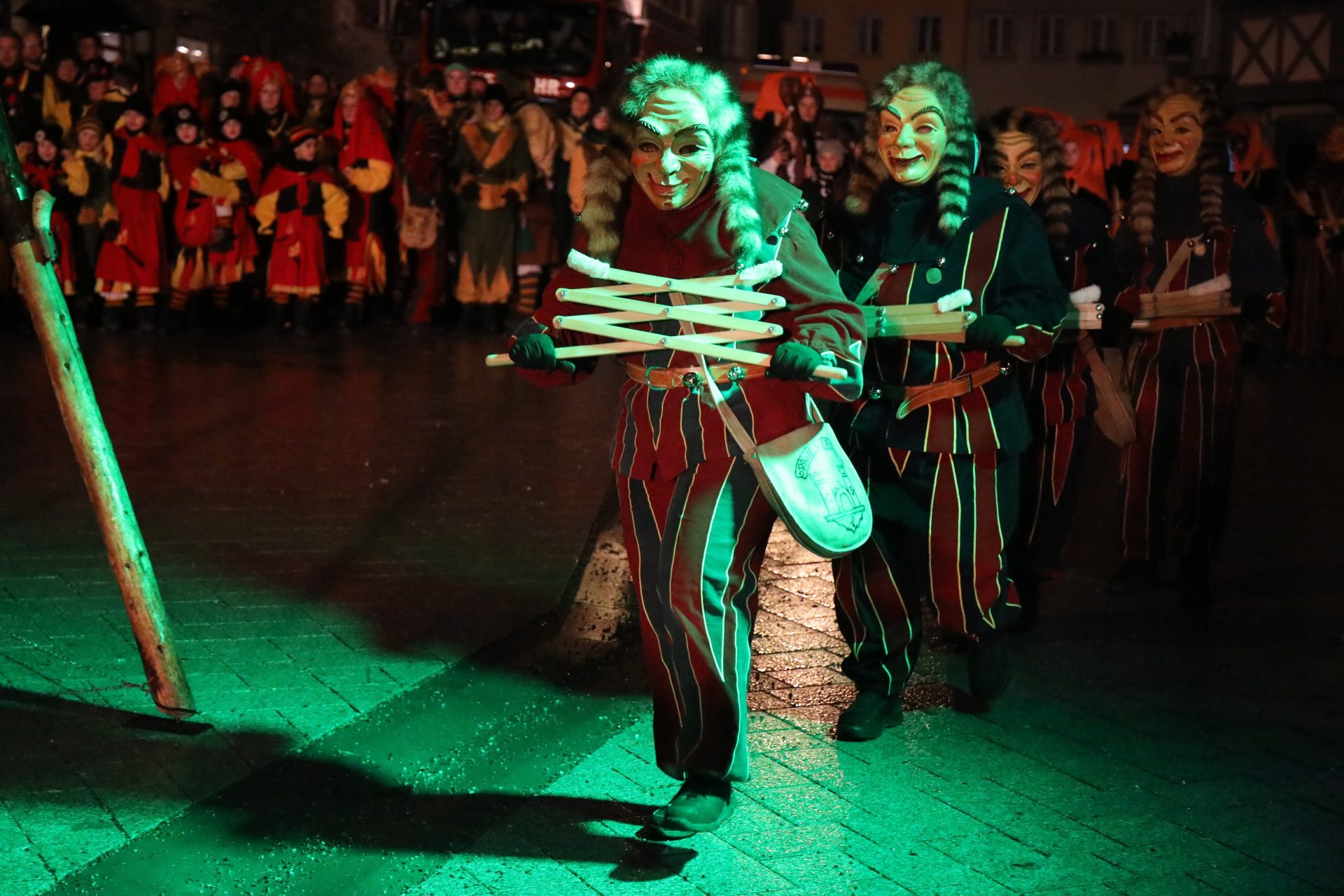 Zur Einstimmung auf die restlichen Programmpunkte der Ravensburger Straßenfasnet haben wir für Sie noch ein paar Eindrücke von der (leider ziemlich nass gewordenen) Maskenbefreiung am Mittwochabend auf dem Gespinstmarkt. Fotos: Kim Enderle