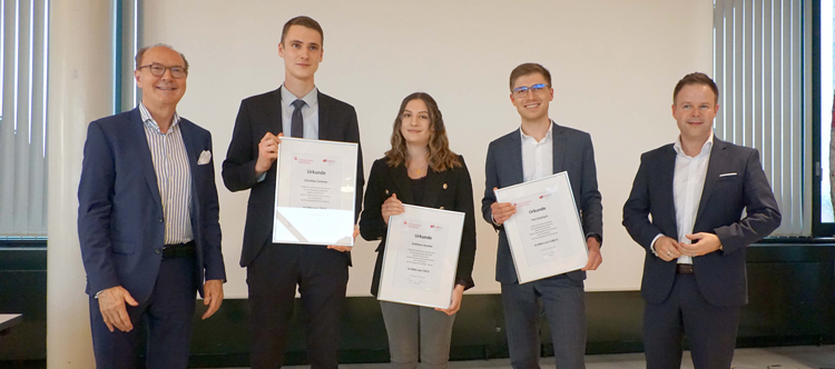 Weil es in diesem Jahr ein knappes Rennen um die besten Studienabschluss BWL-Bank war, gingen noch jeweils 750 Euro Preisgeld an zwei Kommilitonen. Kathleen Anselm aus Eriskirch hat ihr Studium mit einer 1,4 abgeschlossen, auch sie arbeitet weiter bei ihrem Partnerunternehmen, der Volksbank Bodensee-Oberschwaben eG. Christian Sommer aus Markdorf hat sein Studium mit einer 1,5 abschlossen, sein Dualer Partner und derzeitiger Arbeitgeber ist das Internationale Bankhaus Bodensee (IBB) Friedrichshafen.
