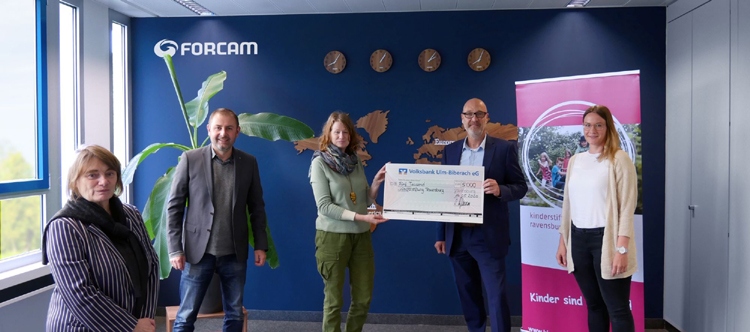 Zusammen mit Co-CEO Dr. Andrea Rösinger und Personalmanagerin Ann-Kathrin Balle übergab er in Weissenau im Namen der FORCAM Belegschaft einen entsprechenden Spendenscheck an Vertreter der Kinderstiftung Ravensburg.