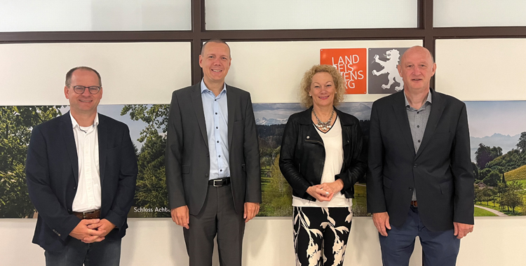 Zur Umsetzung der Projekte „Solidarische Gemeinden“ und „Da-sein für Kinder – Betreuung plötzlich erkrankter Kinder Zuhause“ stellt die Friedrich Schiedel-Stiftung dem Landkreis Ravensburg Fördermittel in Höhe von 300.000 Euro zur Verfügung. Landrat Harald Sievers sowie Sozialdezernent Reinhard Friedel begrüßten am 3. Juli 2023 Melanie Vogt (Vorstandsvorsitzende der Friedrich-Schiedel-Stiftung) sowie Roland Bürkle (Stellvertretender Vorsitzender der Stiftung) zur gemeinsamen Unterzeichnung der Fördervereinbarungen für die beiden Projekte.