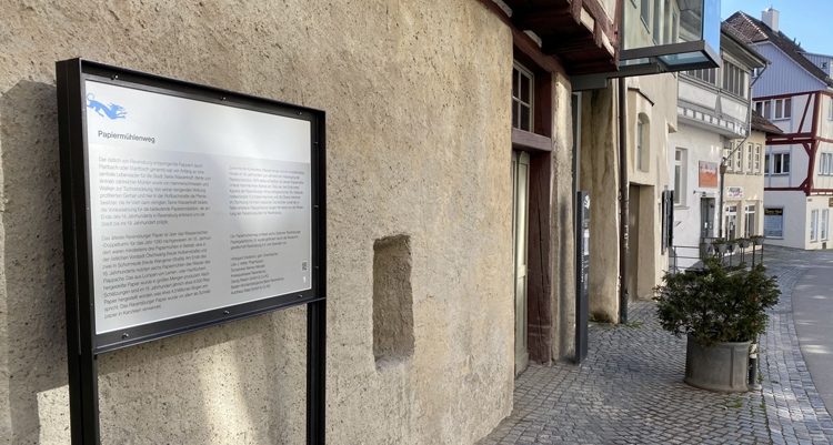 Starttafel des "Ravensburger Papiermühlenwegs" am Humpishaus der Museumsgesellschaft. Bild: MHQ