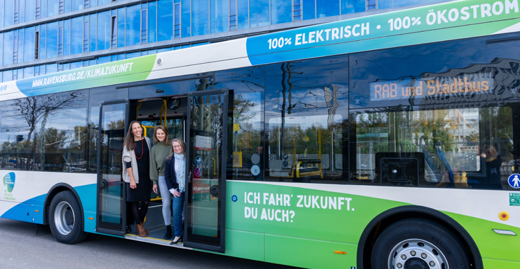 Veerle Buytaert, Manuela Wohlhüter und Jenny Jungnitz (von links) freuen sich über die neuen auffälligen Elektrobusse im Stadtbusverkehr. Bild: Stadt Ravensburg