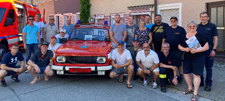 Zum Gruppenbild mit Feuerwehrkommandant Kai Willach und den Vorsitzenden des Städtepartnerschaftsvereins Claudia Maas-Holzhause und ihrer Stellvertreterin Heike Engelhardt MdB nahmen sie Aufstellung um den Coswiger Feuerwehrtrabi „Schorbi“. Mit dem gedachten sie des langjährigen früheren Feuerwehrkommandanten Andreas Schorbogen, der im April unerwartet gestorben war.