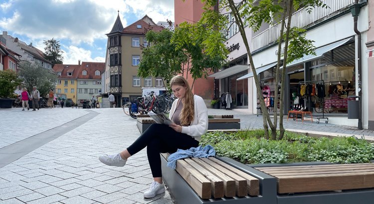 Der neu gestaltete, autofreie Gespinstmarkt hat sich zu einem beliebten Aufenthaltsort in der Ravensburger Innenstadt entwickelt. Vor allem an heißen Tagen genießen es Besucher und Einheimische am Bach, unter den Bäumen oder im Café zu sitzen. Die Stadt hat die Sitzmöglichkeiten jetzt optimiert. Die Sitzpoller am Bach sind nun mit Holzauflagen ausgestattet. Und die Sitzbänke um die Schatten spendenden Bäume sind erhöht worden. Mit einigen Pflanzgefäßen wurde im oberen Teil des Platzes für mehr Grün gesorgt.
