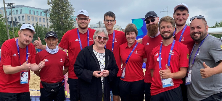 Noch vor der Eröffnungsfeier der Special Olympics Weltsommerspiele 2023 traf sich die Ravensburger Bundestagsabgeordnete Heike Engelhardt am 17. Juni mit Teilnehmer:innen aus ihrem Wahlkreis, um ihnen einen guten Wettkampf zu wünschen. In Berlin kam sie dafür mit Vertreter:innen des Unified Wilhelmsdorf Beach Teams zusammen. Bei diesem Volleyballteam handelt es sich um eine Mannschaft aus geistig beeinträchtigten und nicht beeinträchtigten Spieler:innen der TSG Wilhelmsdorf. Zum Team gehören: Dennis Kutzner, Matthias Aigner, Benedict Eninger, Timo Natzenberg, Maximo Winter, Erik Letzner, Sebastian Manz, Hannes Caspari sowie die Trainer Donato Iasi und Raphael Stäbler.