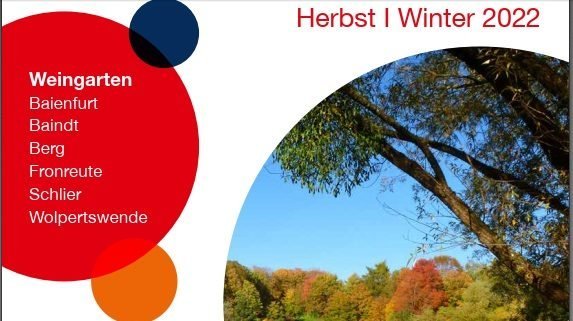 Seit wenigen Tagen liegt im Stadtgebiet das neue Herbst- und Wintersemester 2022/23 Programm der Volkshochschule für die Stadt Weingarten und deren Außenstellen Baienfurt, Baindt, Berg, Fronreute, Schlier und Wolpertswende aus. Auch online unter www.vhs-weingarten.de kann das vielseitige Kursprogramm eingesehen werden.