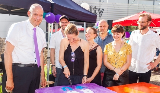 Der offizielle Teil der RWU-Feier fand seinen Abschluss in einer just in time gelieferten, großen RWU-Torte. Diese wurde vom Rektor zusammen mit Martina und Christopher Lewis von der Agentur Brandcode angeschnitten. Der feierliche Nachmittag mündete am Abend in eine Party, die von Studierenden aller vier Fachschaften gemeinsam für die Hochschule organisiert wurde. Die RWU präsentierte sich an diesem Tag als ein Ort der lebendigen Vielfalt unter einem gemeinsamen – neuen – Dach.