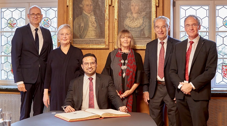 Dr. Suyash Chavan, seit einigen Monaten indischer Generalkonsul in München und als solcher zuständig für Bayern und Baden-Württemberg, hat in der vergangenen Woche Weingarten, die RWU und Tox Pressotechnik kennengelernt. Im Namen der Stadt hieß die Stadträtin und ehrenamtliche Stellvertreterin des Oberbürgermeisters Susanne Münz ihn im Rathaus herzlich willkommen. Dr. Suyash Chavan und seine Delegation wurde im Anschluss die besondere Ehre zuteil, sich ins Goldene Buch der Stadt einzutragen.