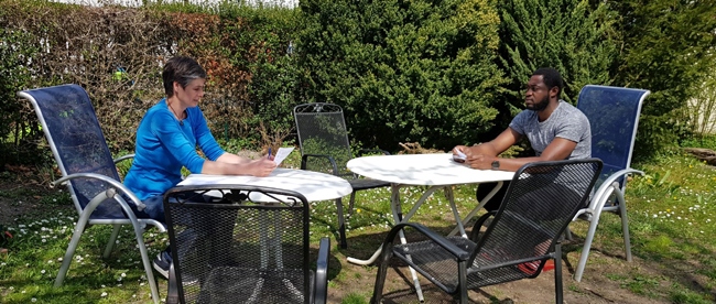 Bei schönem Wetter werden die Face-to-Face-Beratungen nach draußen verlegt – wie hier in den Garten beim Integrationszentrum Weingarten. Bild: Caritas