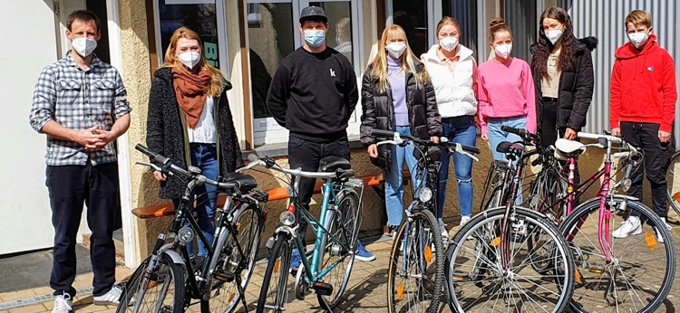 Die Schrauberinnen und Schrauber sind allerdings alles andere als untätig. Am heutigen Freitag konnte wieder ein ehrenamtliches Projekt abgeschlossen werden. Mehrere gebrauchte Fahrräder wurden wieder fahrtüchtig gemacht und stehen nun einem Fahrradkurs für Frauen mit Fluchthintergrund zur Verfügung. Dieser wird von Schülerinnen und Schülern der Edith Stein Schule durchgeführt, welche die Fahrräder heute auch von Lukas Bischof und Robin Holly des Radzimmers in Empfang nehmen durften. Organisiert wird der
